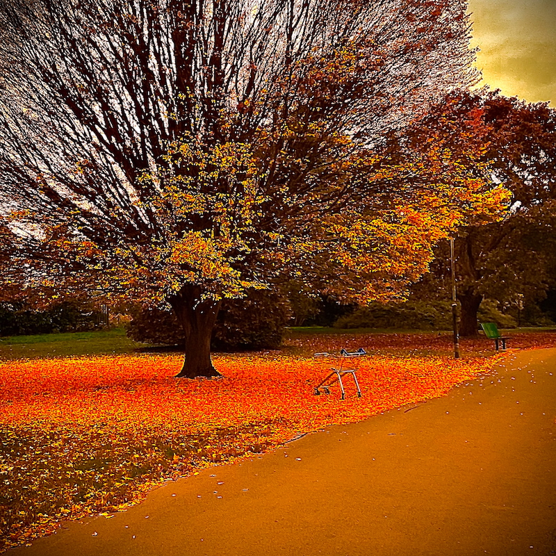 I really like the autumn colours. Not bothered about the lampost or bench as they fit in but not too keen on the trolley. My main concern is the sky at the top right as it does not match the rest of the sky. If you selected the rest of the sky which could be done in LR or PS and, even if you gave it the same treatment as the top right, it would be be dramatic but I think that is what you wanted.